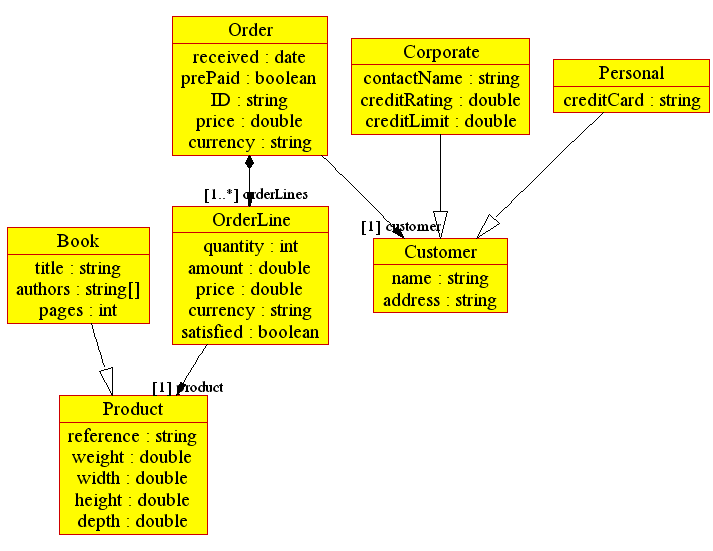 // // This sample model is inspired of the UML Distilled // book by Martin Fowler. // package Example { class Product { string reference; double weight; double width; double height; double depth; } class Book extends Product { string title; string[] authors; int pages; } class Customer { string name; string address; } class OrderLine { Product product; int quantity; double amount; double price; string currency; bool satisfied; } class Order { date received; bool prePaid; string ID; double price; string currency; Customer customer; aggregate OrderLine[] orderLines; } class Corporate extends Customer { string contactName; double creditRating; double creditLimit; } class Personal extends Customer { string creditCard; } }